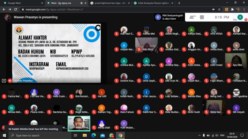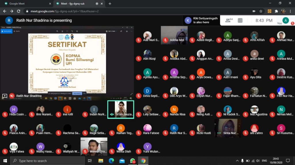 ada tanggal 10 September 2020 bidang telah terlaksana Study Banding dengan Kopma Bumi Siliwangi UPI . Study Banding ini dilaksanakan dengan tujuan untuk bertukar ilmu mengenai perkoperasian. CBT merupakan suatu pendidikan dasar perkoperasian.Study Banding ini dilaksanakan secara online melalui via google meet. Dilaksanakan pukul 20.00 WIB. Teknis yang dilakukan yaitu dengan diadakan forum besar yang melibatkan semua pengurus semua bidang. Forum besar ini diisi dengan agenda perkenalan dan sambutan ketua kopma baik Kopma UNS maupun Kopma BS UPI. Masing masing Kopma melakukan pemaparan Company Profile Kopma masing masing. Diakhir forum besar terdapat penyerahan sertifikat dari masing masing Kopma. Pengurus yanh hadir dari Kopma UNS sebanyak 39 Orang. Setelah forum besar berakhir maka pengurus dibagi menjadi forum forum kecil sesuai dengan bidang.Setiap pengurus bergabung lewat link FGD yang sudah disediakan. Setiap bidang melakukan FGD sesuai bidang masing masing dengan Kopma Bumi Siliwangi UPI.